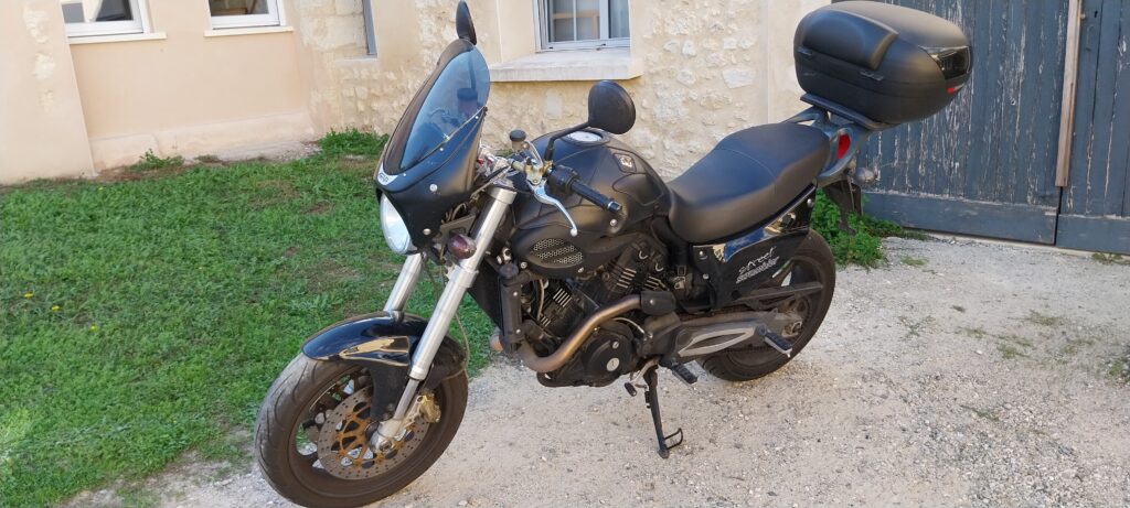 Il est équipé d’un top case SHAD de 46l (2 casques) ainsi que d’une housse réservoir. Je ne m’en sers pas souvent mais c’est un vrai plaisir à chaque fois. Je le vends pour acheter une moto plus routière pour faire des voyages à deux.